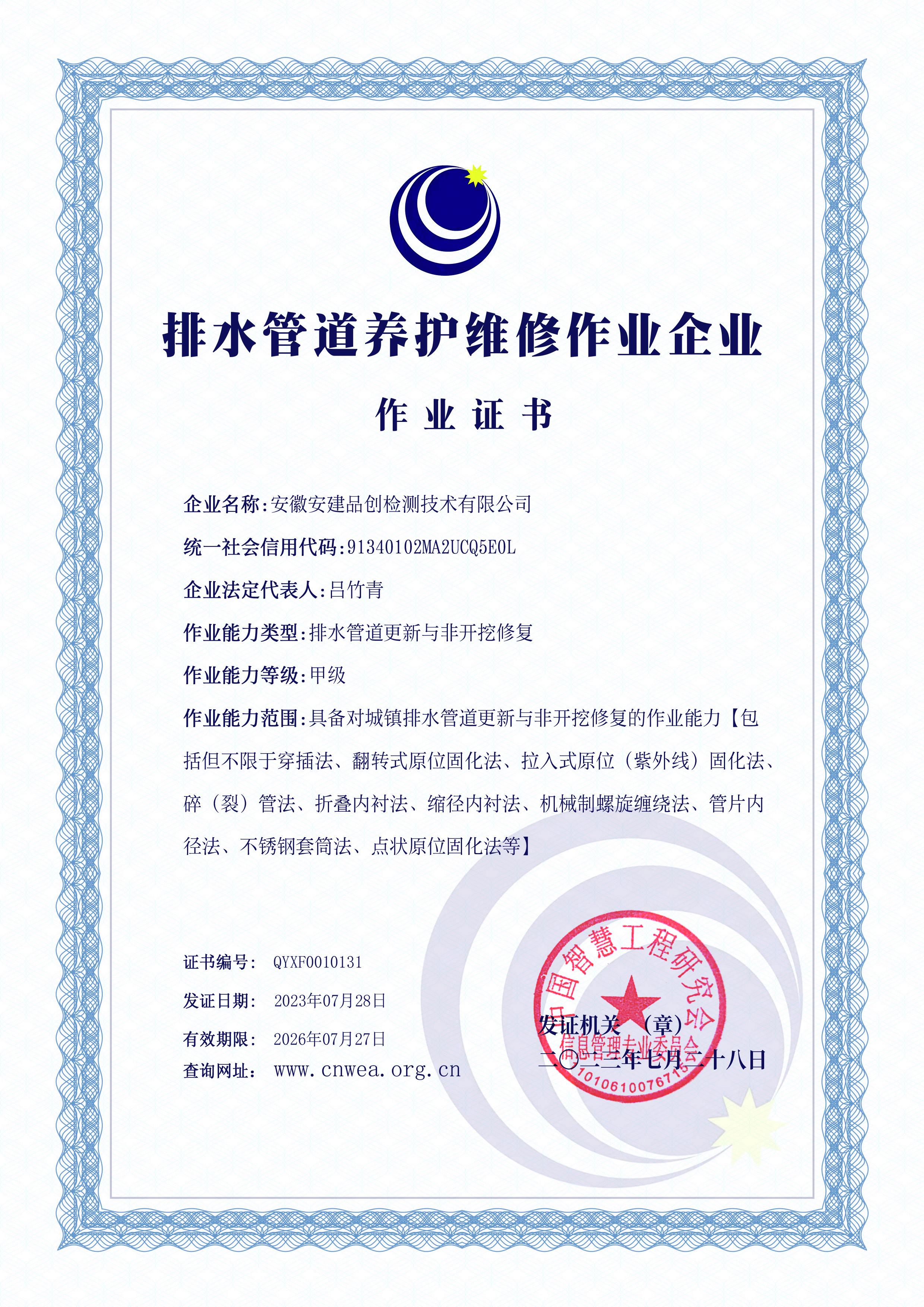 近日,安徽安建品創(chuàng)檢測技術有限公司正式獲得行業(yè)協(xié)會批準,取得城鎮(zhèn)排水管道更新與非開挖修復作業(yè)能力甲級證書。