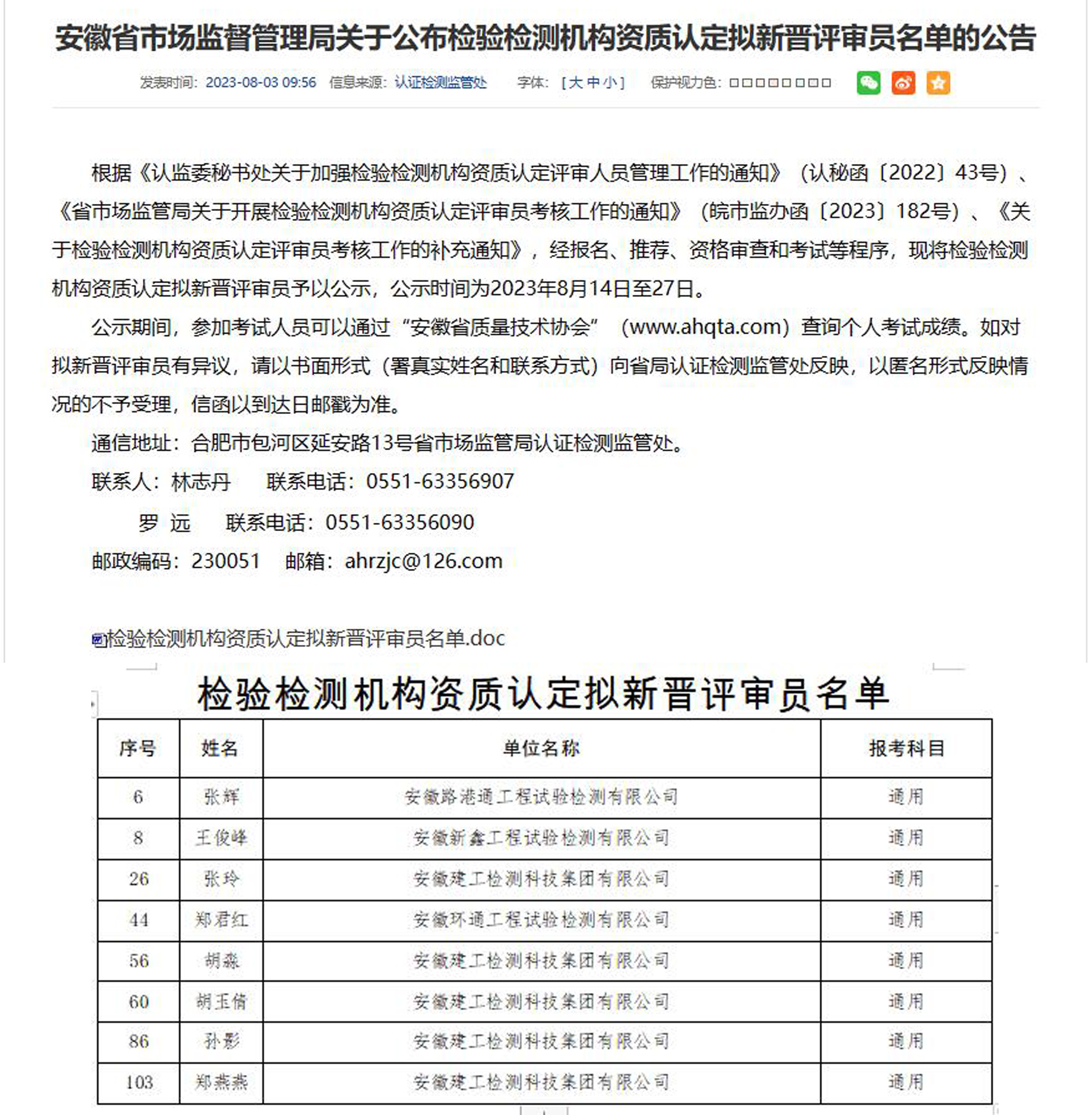 近日,從安徽省市場監(jiān)督管理局傳來喜訊,建工檢測(含子公司)新晉8名檢驗檢測機構(gòu)資質(zhì)認定通用類評審員,本次全省僅新晉通用類評審員103人!
