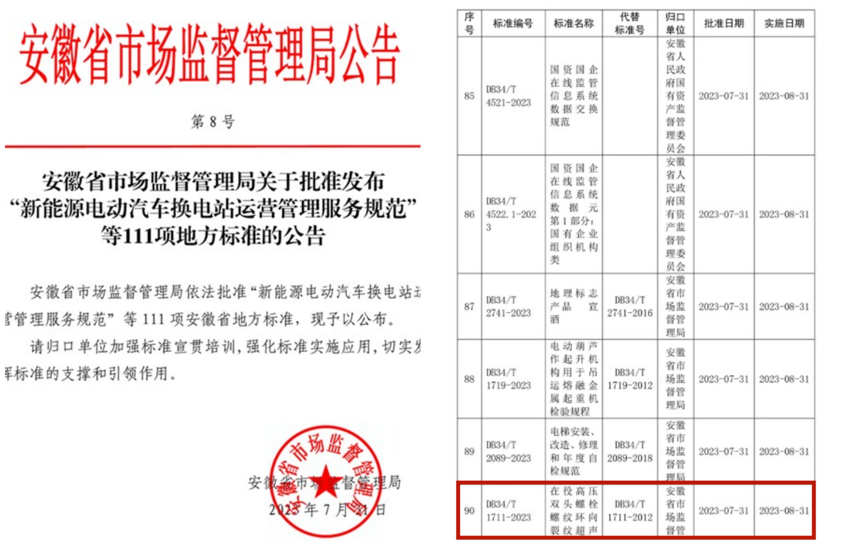 近日,安徽省市場(chǎng)監(jiān)督管理局發(fā)布公告,由安慶市特種設(shè)備監(jiān)督檢驗(yàn)中心和安徽建工檢測(cè)科技集團(tuán)有限公司聯(lián)合主編的安徽省地方標(biāo)準(zhǔn)《在役高壓雙頭螺栓環(huán)向裂紋超聲波檢測(cè)方法》(DB34/T1711-2023)正式發(fā)布。