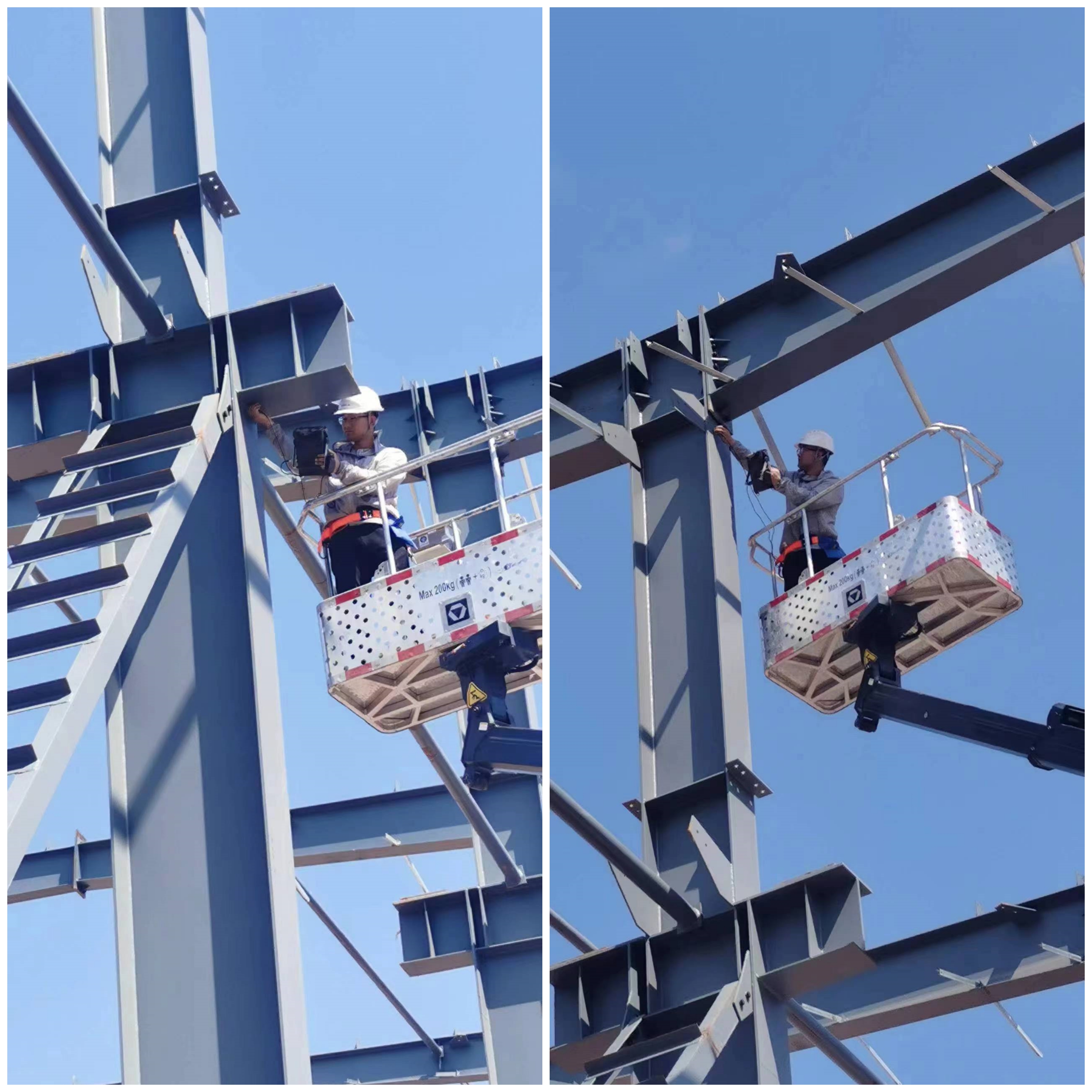 在安徽浙建鋼結(jié)構(gòu)有限公司年產(chǎn)6萬噸鋼構(gòu)件項(xiàng)目現(xiàn)場,技術(shù)人員對鋼結(jié)構(gòu)進(jìn)行現(xiàn)場檢測。
