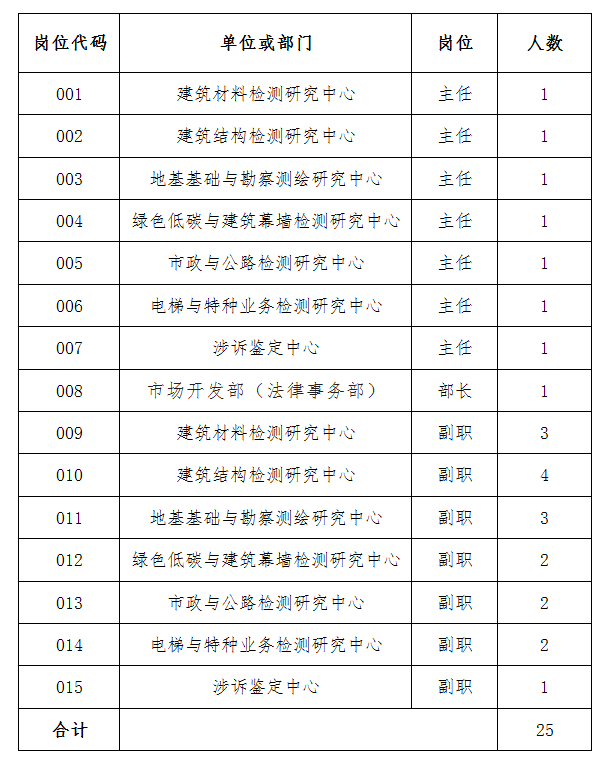 (一)具體崗位:檢測研究中心主任、市場開發(fā)部(法律事務(wù)部)部長等中層正職崗位8名;檢測研究中心副主任、主任工程師等中層副職崗位17名。