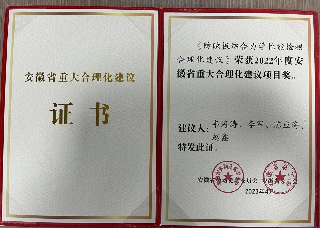 喜報一:近日,安徽省總工會頒發(fā)2022年度重大合理化建議獎項證書,環(huán)通公司榮獲2項2022年度安徽省重大合理化建議項目獎。