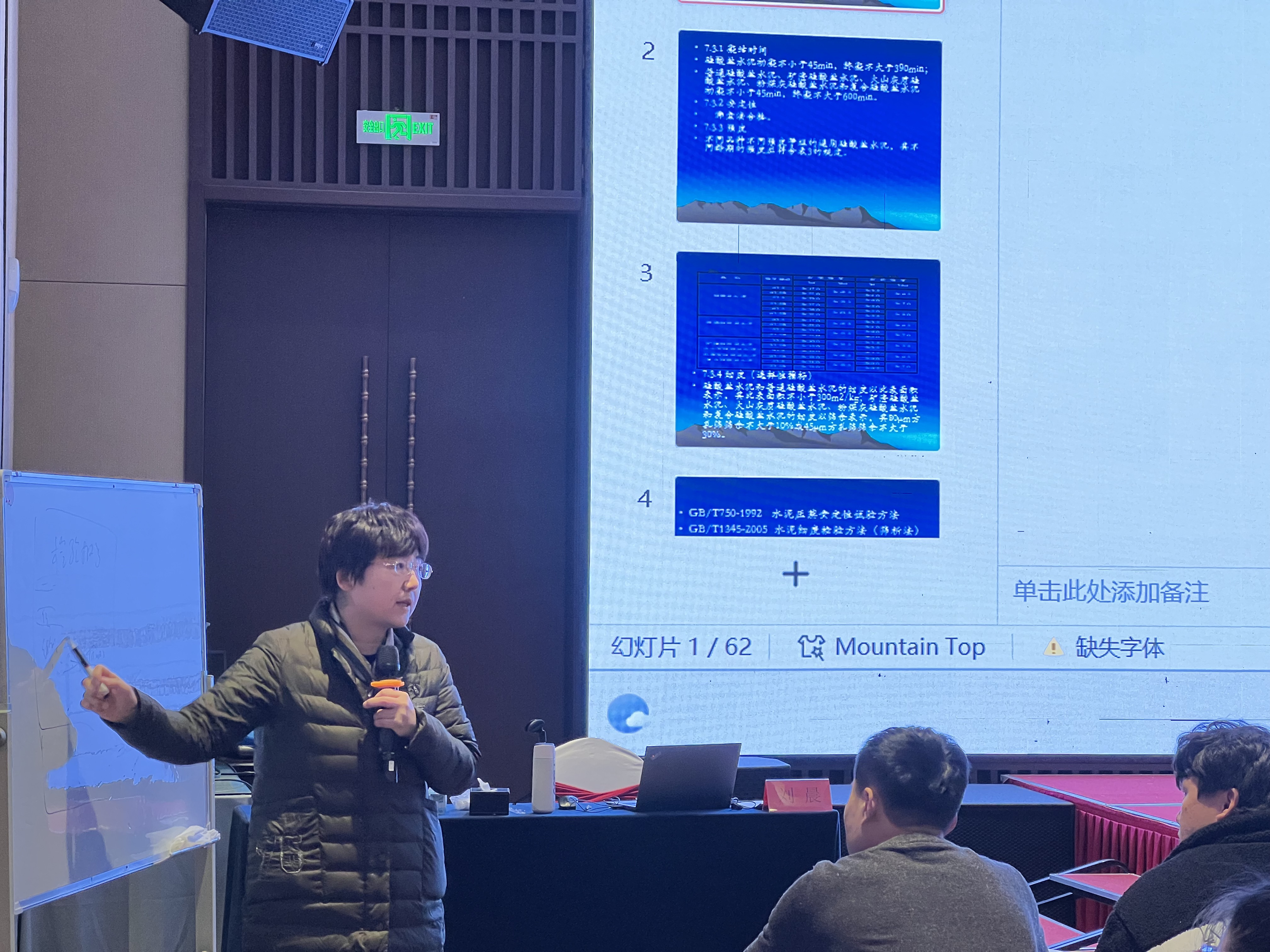 本次培訓邀請的主講老師是《通用硅酸鹽水泥》GB175-2023標準的主要起草人、中國建筑材料科學研究總院教授級高工、全國水泥標準化技術(shù)委員會副秘書長劉晨老師。劉老師針對《通用硅酸鹽水泥》標準中引用的一些重要標準、水泥組分的細化和調(diào)整、水泥混合材料標準的修訂內(nèi)容、主要技術(shù)指標要求以及對前期發(fā)布的《水泥膠砂強度檢驗方法(ISO法)》等7個標準所涉及的水泥標準稠度用水量、凝結(jié)時間、安定性、強度、比表面積、篩析法、壓蒸安定性等七項物理性能試驗方法介紹講解,同時包括對儀器設備選擇、標定、操作步驟及要領(lǐng)、數(shù)據(jù)處理等實際操作要領(lǐng)進行了詳細授課;并積極與在場參培人員探討交流了水泥檢測中遇到的難題和解決措施,幫助參培人員答疑解惑。