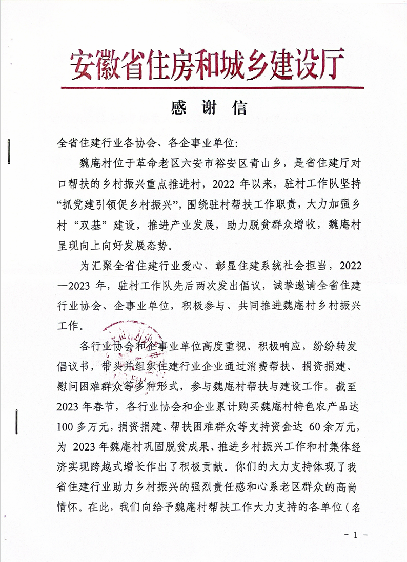 省住房和城鄉(xiāng)建設(shè)廳致信感謝我司助力脫貧攻堅(jiān)工作