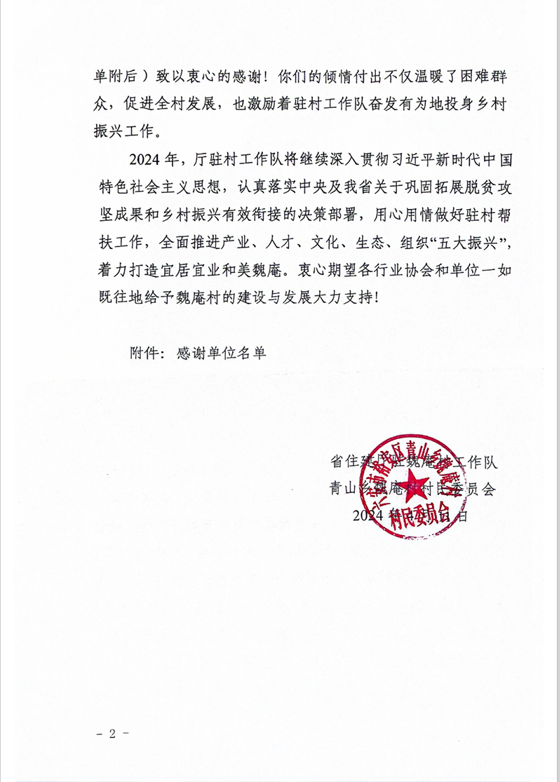 2024年,建工建測(cè)將以二十大精神為指引,深入貫徹落實(shí)黨中央、省委省政府關(guān)于鞏固脫貧攻堅(jiān)和鄉(xiāng)村振興的工作要求,堅(jiān)守初心使命、堅(jiān)定使命擔(dān)當(dāng),積極履行國(guó)有企業(yè)社會(huì)責(zé)任,繼續(xù)加大幫扶力度,助力地方經(jīng)濟(jì)發(fā)展和建設(shè),為推進(jìn)鄉(xiāng)村振興、助力魏庵村經(jīng)濟(jì)社會(huì)發(fā)展工作繼續(xù)貢獻(xiàn)檢測(cè)力量。