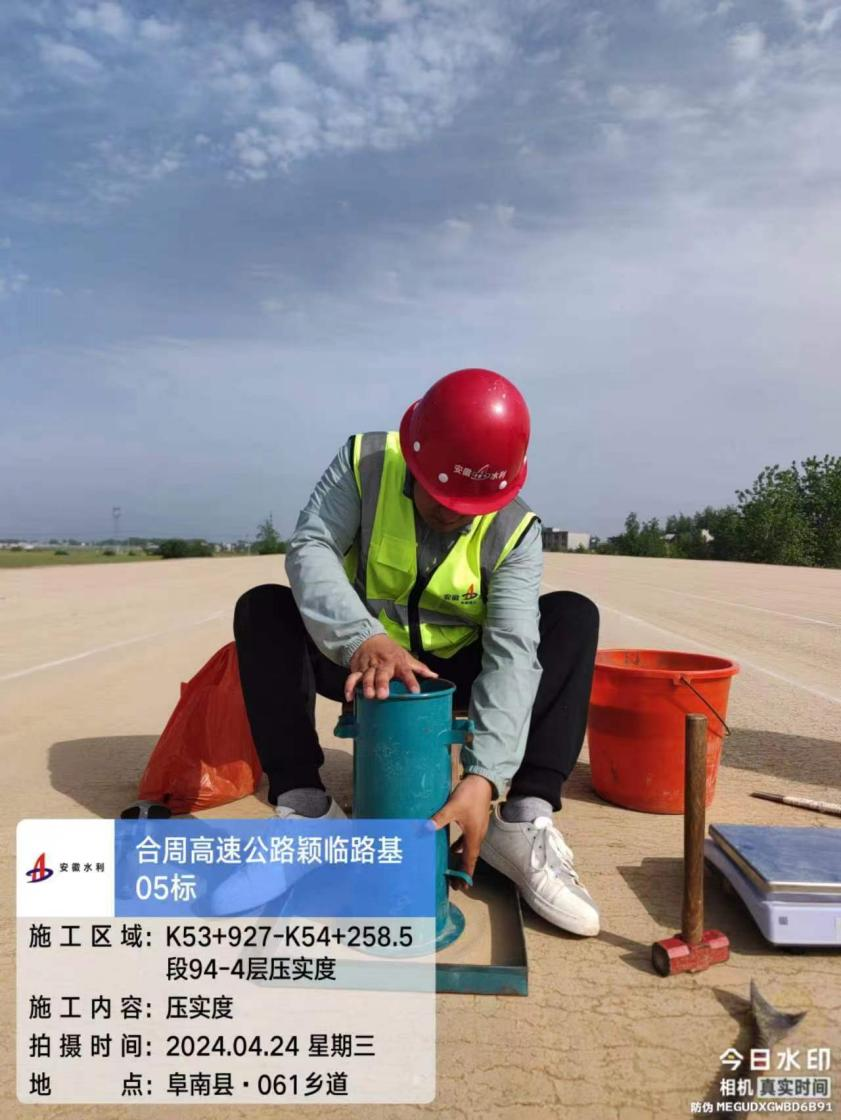 郭彬,合周高速公路潁臨段路基05標(biāo)工地試驗(yàn)室主任,為跟進(jìn)施工方工作進(jìn)度,提升檢測(cè)質(zhì)量和服務(wù)水平,身著防曬服和安全背心,頭頂安全帽,不懼正午的太陽(yáng)和紫外線的沖擊,正在科學(xué)嚴(yán)謹(jǐn)?shù)剡M(jìn)行壓實(shí)度試驗(yàn),為合周高速潁臨段路基05標(biāo)項(xiàng)目的建設(shè)提供質(zhì)量安全保障。