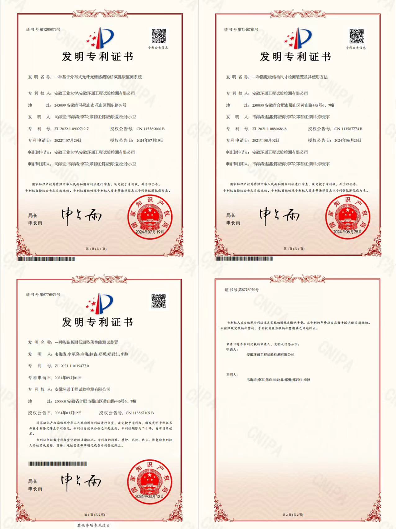 長期以來,環(huán)通公司始終把科技創(chuàng)新視為企業(yè)發(fā)展的核心動力,不斷加大研發(fā)投入,致力于攻克行業(yè)技術難題,推動產業(yè)升級。今年截至目前,環(huán)通公司共獲得三項國家發(fā)明專利授權,另外兩項分別是自主研發(fā)的《一種防眩板結構尺寸檢測裝置及其使用方法》和《一種防眩板耐低溫墜落性能測試裝置》。