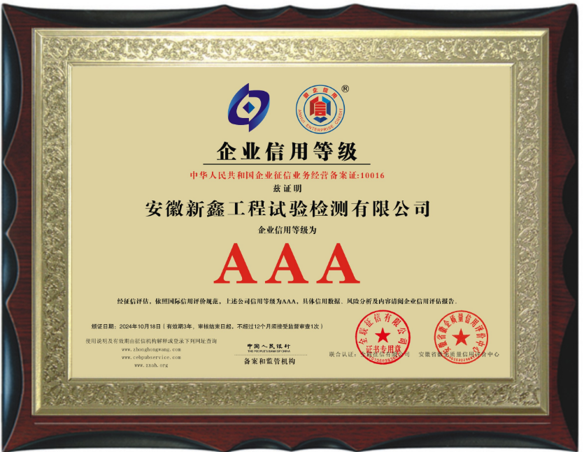 近日,安徽新鑫工程試驗(yàn)檢測有限公司被全聯(lián)征信有限公司和安徽省徽企質(zhì)量信用評(píng)價(jià)中心認(rèn)定為“AAA級(jí)信用企業(yè)”,標(biāo)志著新鑫公司在規(guī)范運(yùn)營、誠信經(jīng)營上獲得國家相關(guān)部門及權(quán)威機(jī)構(gòu)的認(rèn)可。