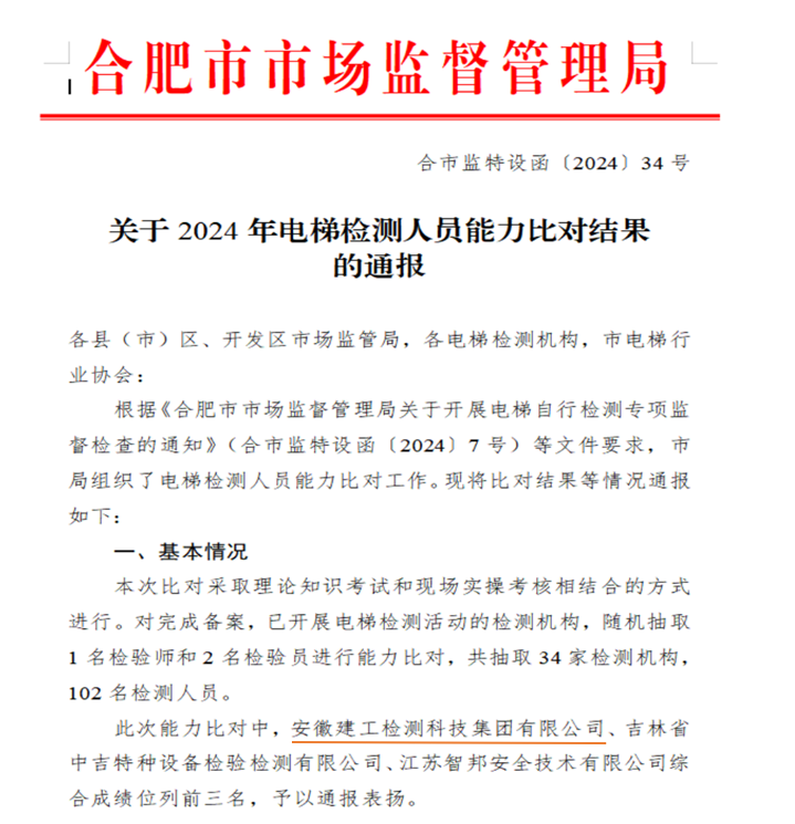 喜報!建工檢測榮獲合肥市2024年電梯檢測質量比對競賽冠軍!