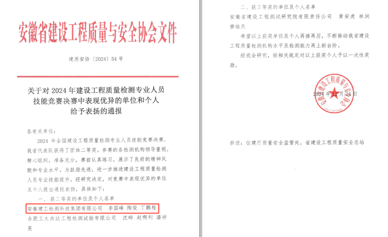 近日,安徽省建設工程質量與安全協(xié)會對2024年建設工程質量檢測專業(yè)人員技能競賽決賽中表現(xiàn)優(yōu)異的單位和個人給予通報表揚,建工檢測參賽選手在競賽中摘獲二等獎,受到通報表揚。
