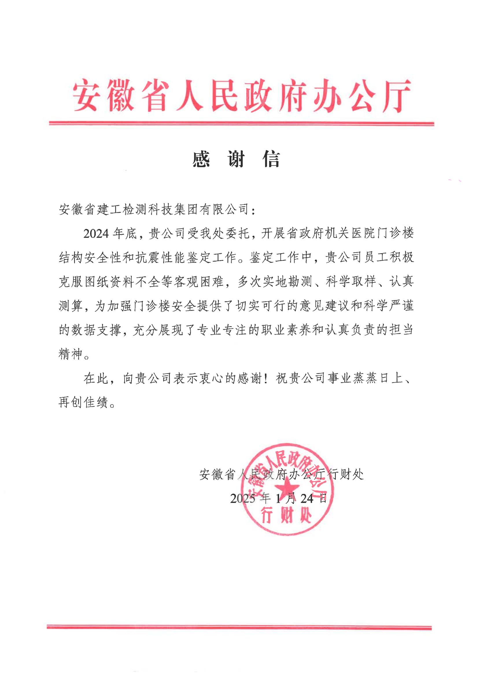 安徽省人民政府辦公廳向建工檢測發(fā)來感謝信!