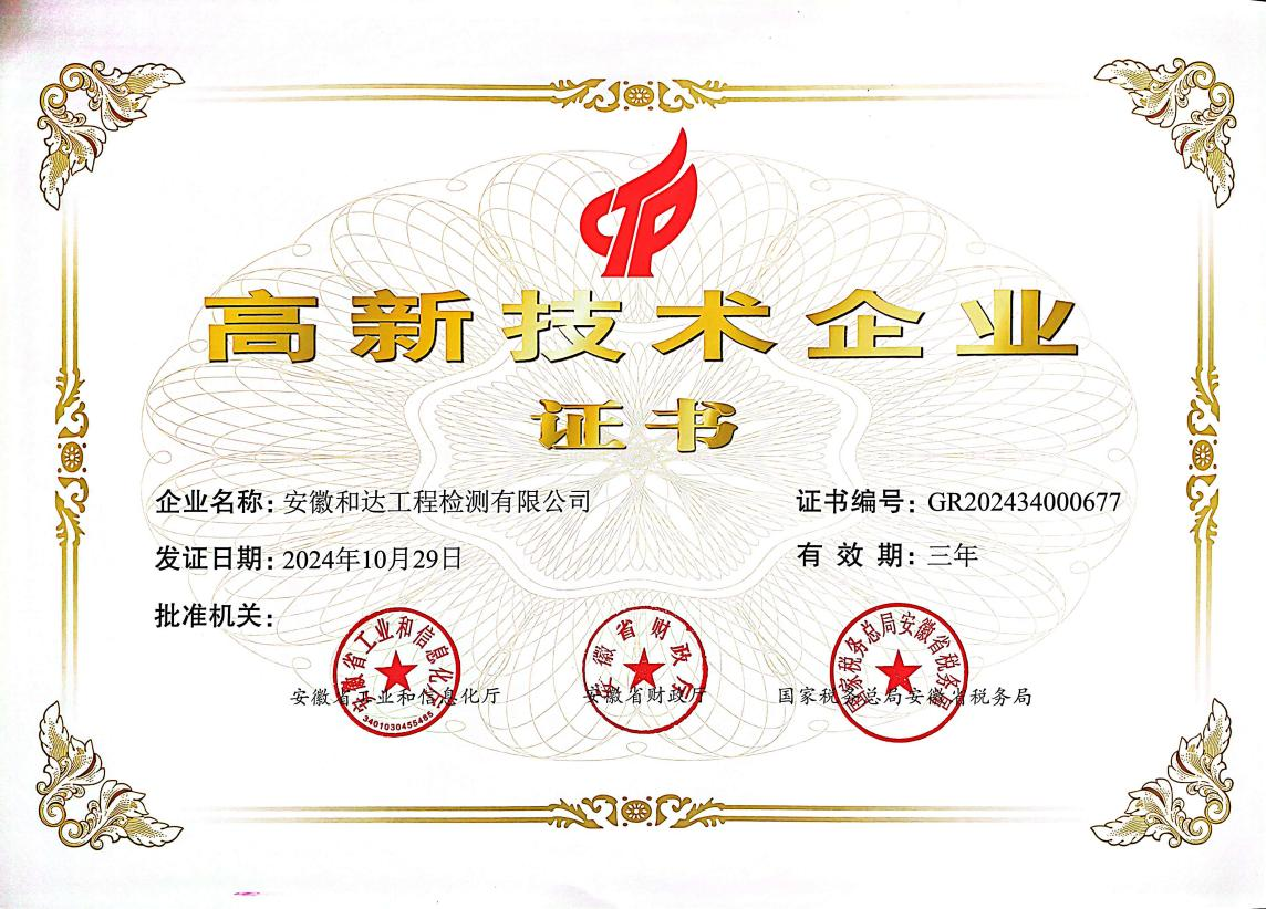 此次成功取得“高新技術(shù)企業(yè)”證書,不僅是對(duì)和達(dá)檢測(cè)核心自主創(chuàng)新能力、科技成果轉(zhuǎn)化及企業(yè)管理能力的充分肯定,也是和達(dá)檢測(cè)科技研發(fā)和技術(shù)創(chuàng)新取得進(jìn)步的重要標(biāo)志。