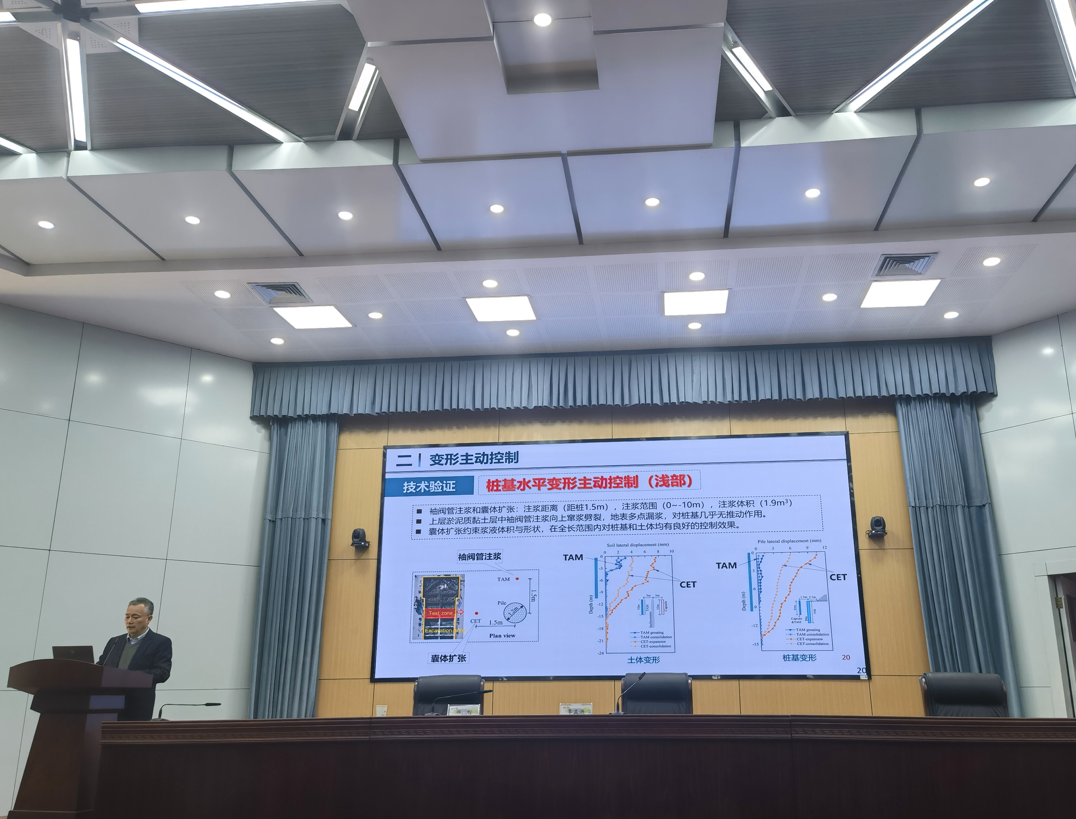 鄭剛教授在報(bào)告中指出,傳統(tǒng)的被動(dòng)變形控制方法難以滿足軟土地區(qū)交通基礎(chǔ)設(shè)施在鄰近施工擾動(dòng)下的毫米級(jí)微小變形控制要求。針對(duì)這一難題,科研團(tuán)隊(duì)提出了軟變形主動(dòng)控制理論及關(guān)鍵技術(shù),實(shí)現(xiàn)了“微小變形可控、超標(biāo)變形可糾”,有效保障了軟土地區(qū)已服役交通基礎(chǔ)設(shè)施的正常使用和安全穩(wěn)定。同時(shí),針對(duì)軟土工程整體性較低、局部破壞易引發(fā)連續(xù)大變形等行業(yè)痛點(diǎn),建立了整體安全性能控制理論及高效優(yōu)化方法,為復(fù)雜地基工程的長期安全提供了技術(shù)支撐。