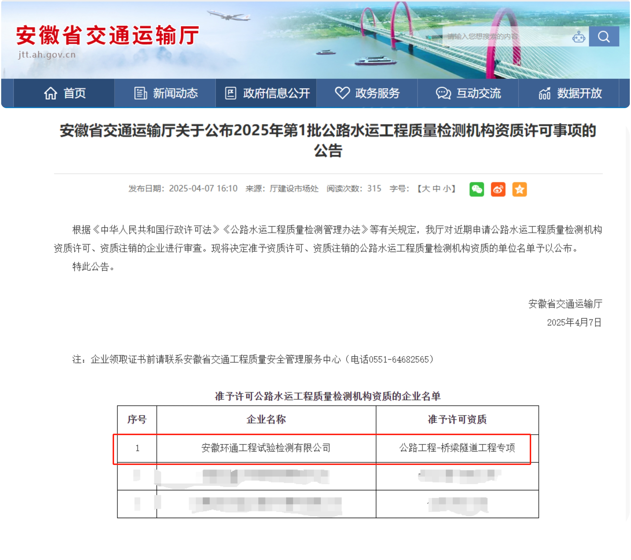 近日,安徽省交通運(yùn)輸廳公布了2025年第1批公路水運(yùn)工程質(zhì)量檢測機(jī)構(gòu)資質(zhì)許可決定。建工檢測所屬環(huán)通公司成功取得公路工程-橋梁隧道工程專項(xiàng)資質(zhì)。