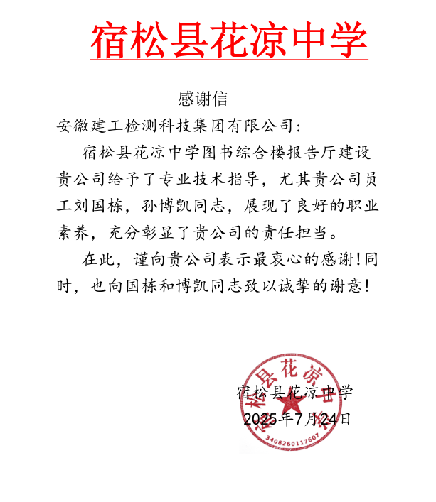 近日,宿松縣花涼中學(xué)向建工檢測(cè)發(fā)來(lái)感謝信,對(duì)公司特檢中心在宿松縣花涼中學(xué)圖書(shū)綜合樓報(bào)告廳建設(shè)過(guò)程中給予的專(zhuān)業(yè)技術(shù)指導(dǎo)表示感謝,并對(duì)公司的責(zé)任擔(dān)當(dāng)和員工的職業(yè)素養(yǎng)給予充分肯定。