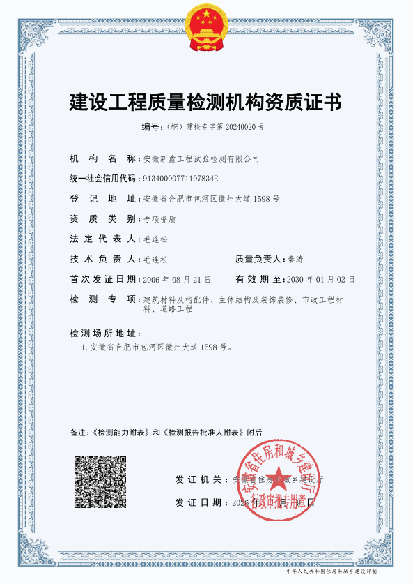 近日,經(jīng)安徽省住房和城鄉(xiāng)建設(shè)廳核準(zhǔn),新鑫檢測順利獲批主體結(jié)構(gòu)及裝飾裝修工程、道路工程專項(xiàng)檢測資質(zhì)。