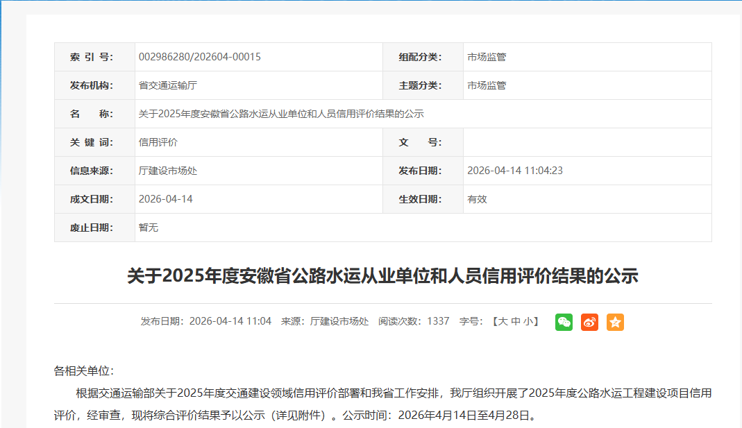 近日,安徽省交通運輸廳公布了2025年度公路水運工程試驗檢測機構(gòu)信用評價結(jié)果。安徽新鑫工程試驗檢測有限公司憑借規(guī)范的經(jīng)營管理、過硬的技術(shù)實力及良好的誠信履約表現(xiàn),綜合評分達97.92分,成功獲評AA級信用等級。