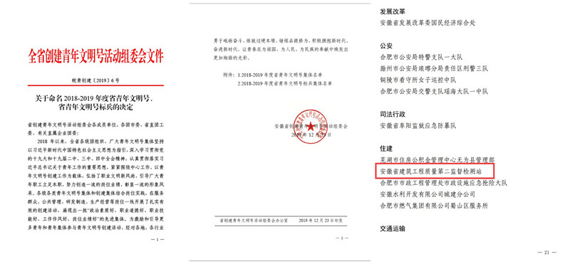 近日,從安徽省住建廳創(chuàng)建青年文明號(hào)活動(dòng)組委會(huì)傳來(lái)喜訊,安徽建科質(zhì)檢二站被命名為2018-2019年度 “青年文明號(hào)標(biāo)兵”榮譽(yù)稱號(hào),在二站榮譽(yù)墻上再添一抹青春色彩。