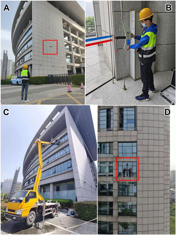二站幕墻所承接的合肥市政務(wù)綜合樓位于東流路100號,幕墻面積總計(jì)10.03萬平方米,包含短槽支承石材幕墻,背栓支承石材幕墻,明框玻璃幕墻,半隱框玻璃幕墻,全隱框玻璃幕墻,自平衡拉索玻璃幕墻,點(diǎn)支承玻璃幕墻和全玻幕墻等多種類型的幕墻。在數(shù)據(jù)采集及取樣過程中,二站幕墻所檢測人員分為無人機(jī)組、高空滑板組、登高車組以及應(yīng)急組等4個小組,按計(jì)劃有條不紊地進(jìn)行工作,至5日晚,現(xiàn)場工作全部完成。本次現(xiàn)場工作共計(jì)拆卸50余處隱蔽節(jié)點(diǎn),并全部復(fù)原,無安全事故發(fā)生,現(xiàn)場工作得到委托方的高度評價。