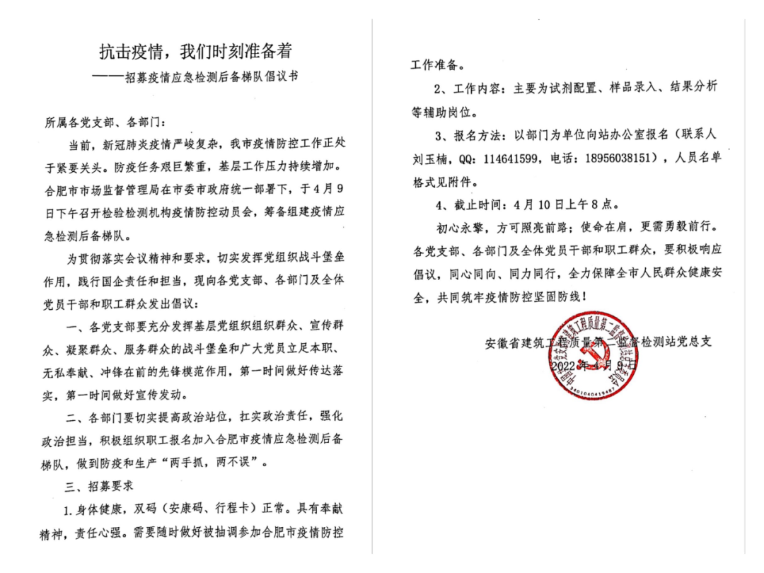 當(dāng)晚,全站上下聞令而動,積極響應(yīng)征募號召。截止4月10日8時許,80余名專業(yè)檢驗檢測人員自愿報名加入合肥市疫情應(yīng)急檢測后備梯隊,隨時準(zhǔn)備接受抽調(diào),隨時準(zhǔn)備在抗“疫”最前線完成檢驗試劑配置、樣品錄入、結(jié)果分析等工作。