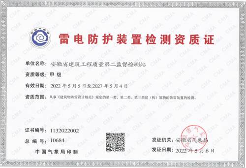 5月6日,根據(jù)安徽省氣象局批準(zhǔn)認(rèn)定,省質(zhì)檢二站榮升雷電防護(hù)裝置檢測甲級資質(zhì)。本次資質(zhì)升級認(rèn)可批準(zhǔn)通過標(biāo)志著二站已具備從事《建筑物防雷設(shè)計規(guī)范》規(guī)定的第一類、第二類、第三類建(構(gòu))筑物防雷裝置的檢測能力。