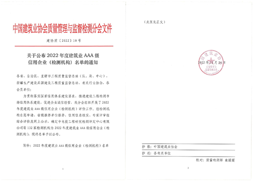 中國(guó)建筑業(yè)AAA信用等級(jí)企業(yè),是目前國(guó)內(nèi)行業(yè)信用評(píng)價(jià)的最高等級(jí),由中國(guó)建筑業(yè)協(xié)會(huì)實(shí)行三年動(dòng)態(tài)管理。在本次評(píng)比中,我站在誠(chéng)信經(jīng)營(yíng)、規(guī)范管理、健康發(fā)展、承擔(dān)社會(huì)責(zé)任等方面均表現(xiàn)突出,成功獲評(píng)“2022年度中國(guó)建筑業(yè)AAA級(jí)信用企業(yè)(檢測(cè)機(jī)構(gòu))”。這既是對(duì)我站綜合信用的高度肯定,同時(shí)也是對(duì)我站一直以來誠(chéng)信健康發(fā)展的認(rèn)可,是企業(yè)市場(chǎng)競(jìng)爭(zhēng)力和綜合實(shí)力的具體表現(xiàn)。