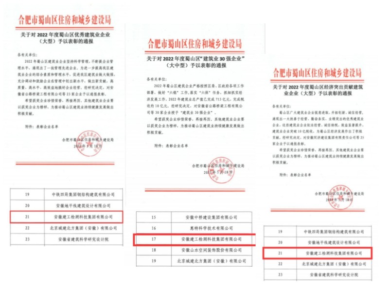 2023年5月18日,合肥市蜀山區(qū)住房和城鄉(xiāng)建設(shè)局發(fā)布對(duì)區(qū)內(nèi)建筑業(yè)企業(yè)予以表彰的通報(bào),我司榮獲“優(yōu)秀建筑業(yè)企業(yè)”、“建筑業(yè)30強(qiáng)企業(yè)”、“經(jīng)濟(jì)突出貢獻(xiàn)建筑業(yè)企業(yè)”3類獎(jiǎng)項(xiàng)。