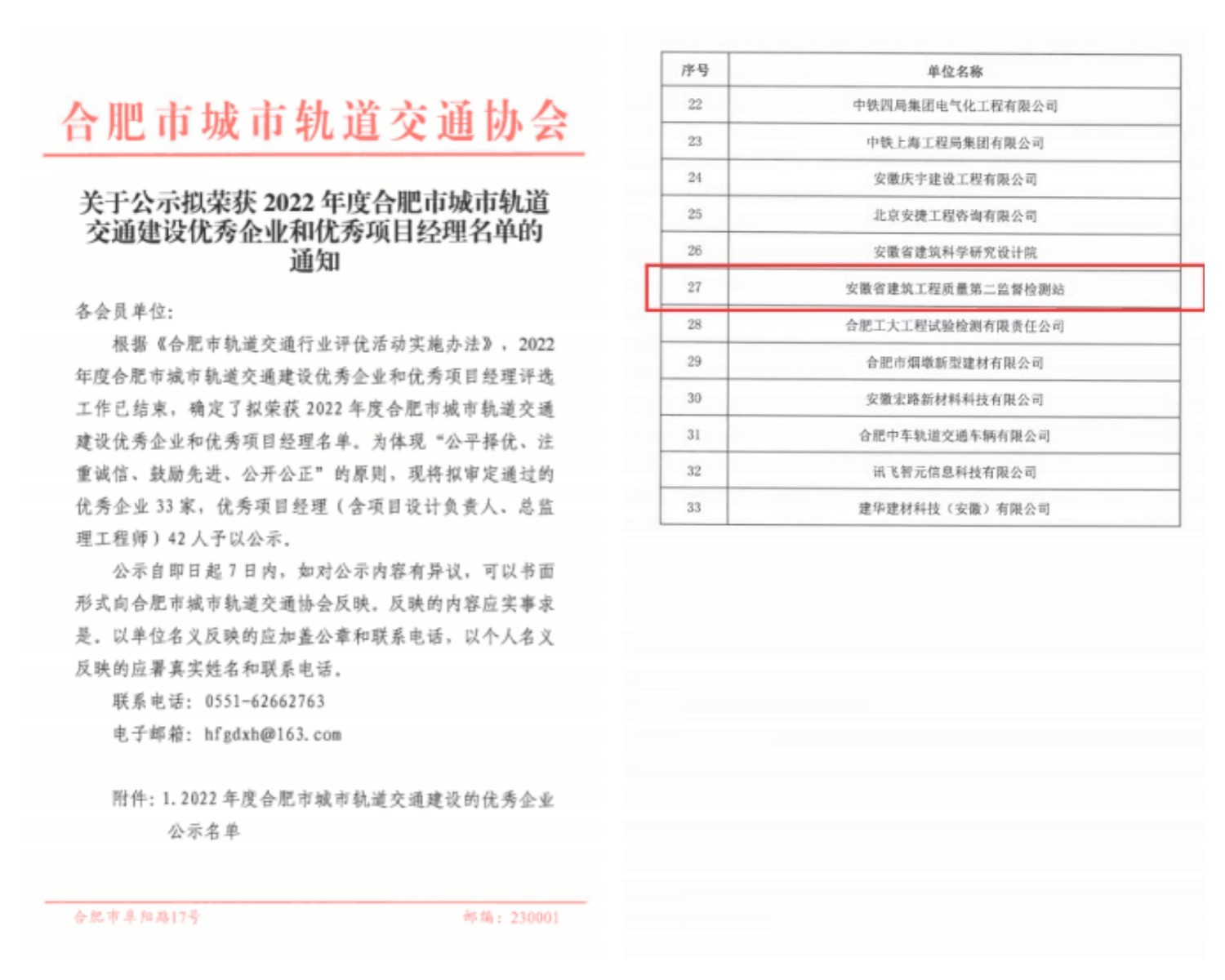 喜訊!建工檢測(cè)榮獲2022年度合肥市城市軌道交通建設(shè)“優(yōu)秀企業(yè)”稱號(hào)